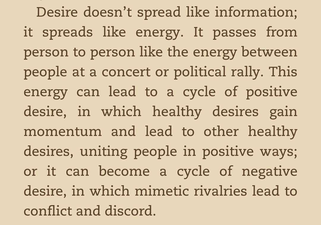 The good news is we can choose our models once we become capable of identifying the good from the bad. Also, it is important to note that mimetic desire can be channeled to bring about good, it isn’t always bad.